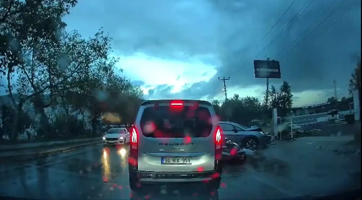 Orhangazi ilçesinde ters şeride giren otomobile çarpan motosikletteki 2 kişinin yaralandığı kaza anı, başka otomobilin araç kamerasına yansıdı.