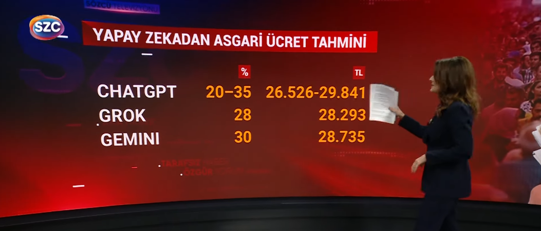 Milyonların merakla beklediği asgari ücret içinse Sözcü TV; ayrıntılı ekonomik bilgiler sunarak Chat GPT, Gemici ve Grok’a asgari ücretin ne kadar olacağını sordu.