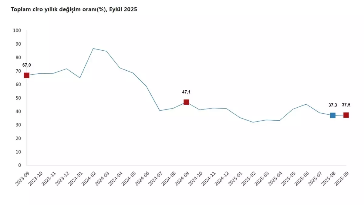 TÜRKİYE İstatistik Kurumu (TÜİK), eylül ayında sanayi, inşaat, ticaret ve hizmet sektörleri toplamında ciro endeksinin yıllık yüzde 37,5, aylık yüzde 4,6 arttığını açıkladı.