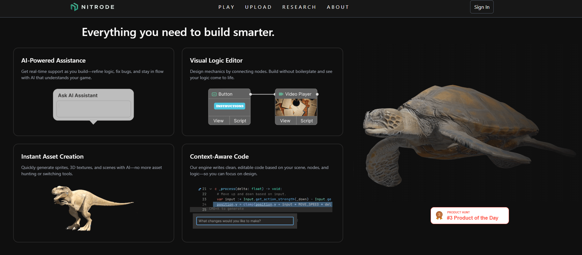 Nitrode, yapay zeka destekli bir oyun motoru olarak dikkat çekiyor. Godot 4.0 altyapısını kullanan bu platform, kullanıcılarına 3D oyunlar tasarlama, kodlama ve dağıtma süreçlerinde yardımcı oluyor.