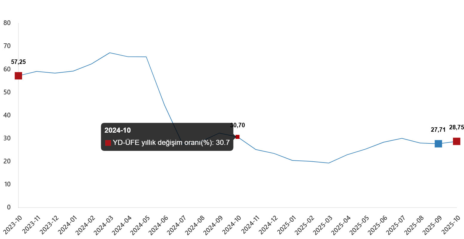 YD-ÜFE 2025 yılı Ekim ayında bir önceki aya göre %0,90 artış, bir önceki yılın Aralık ayına göre %28,69 artış, bir önceki yılın aynı ayına göre %28,75 artış ve on iki aylık ortalamalara göre %25,13 artış gösterdi.